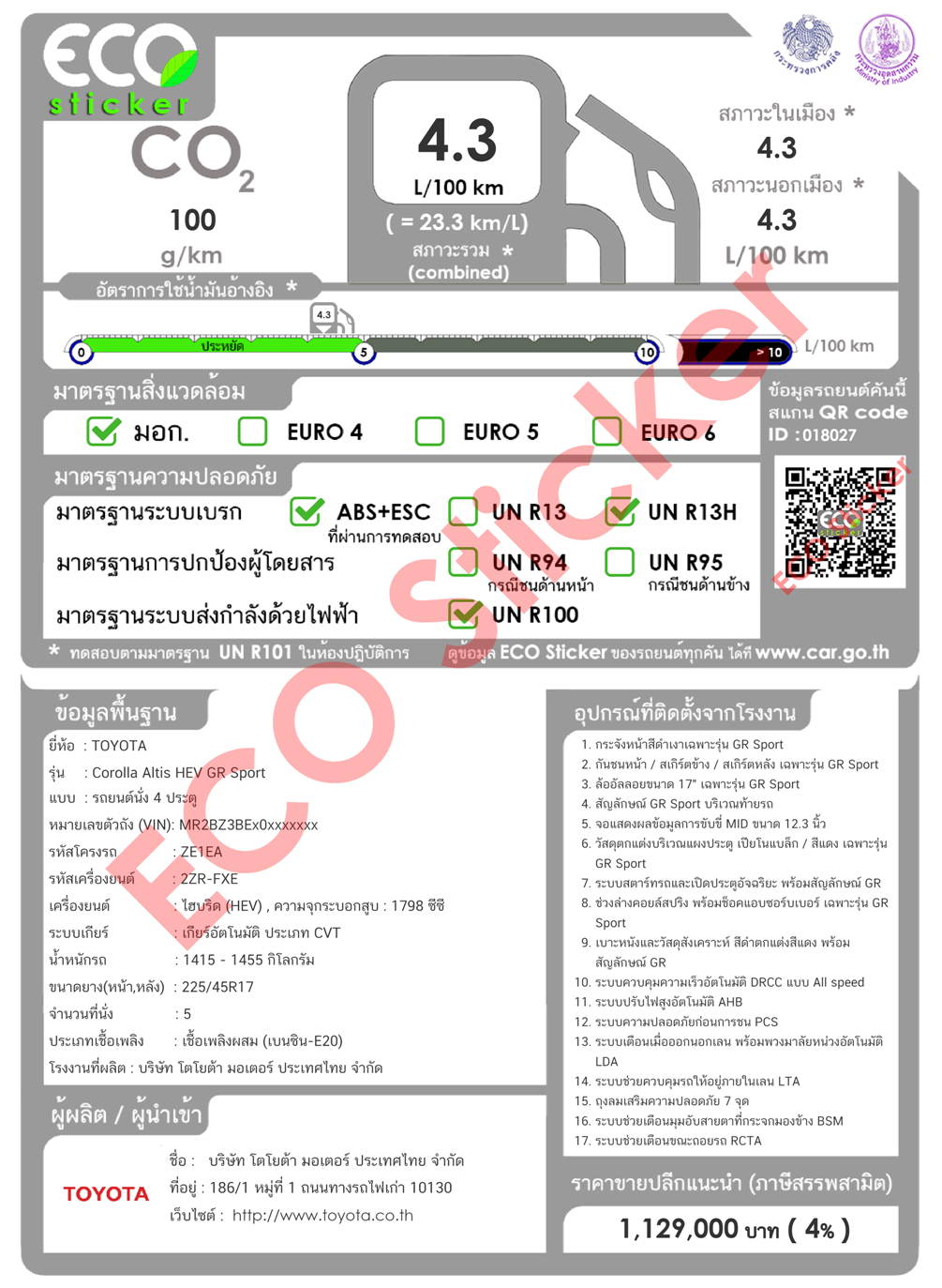รุ่น HEV GR SPORT เครื่องยนต์ Hybrid ราคา 1,129,000 บาท