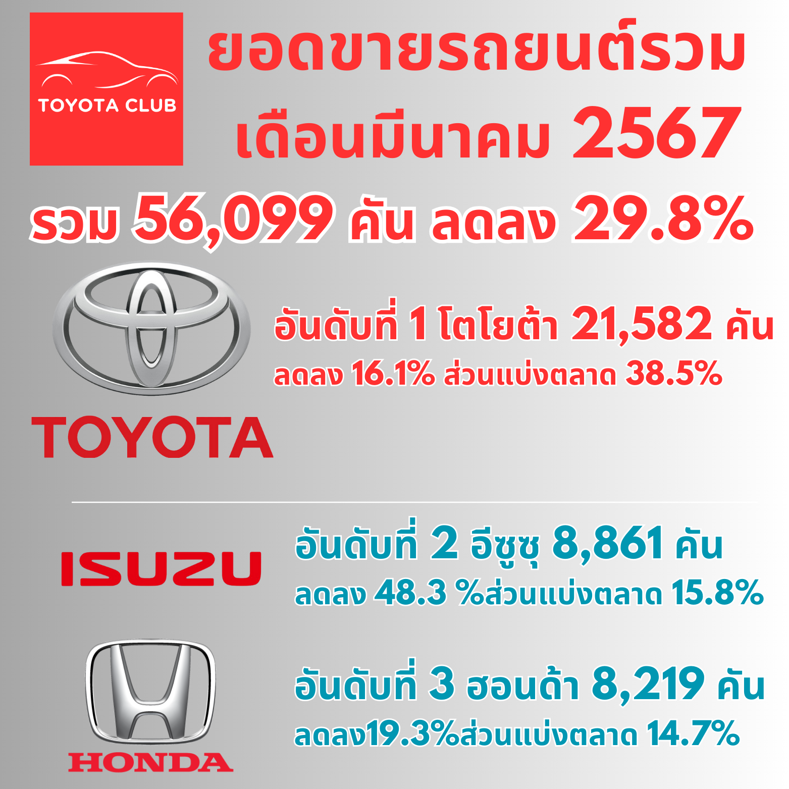 รายงานสถิติการขายรถยนต์ประจำเดือนมีนาคม ปี 2567 ด้วยยอดขาย 56,099 คัน ลดลง 29.8% ประกอบด้วย