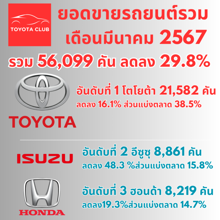 ยอดขายรถยนต์ เดือนมีนาคม ปี 2567 รวม 56,099 คัน ลดลง 29.8%
