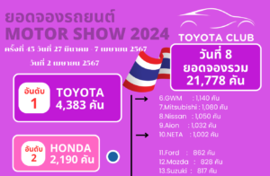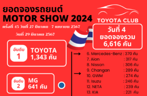 ยอดจองรถยนต์ ภายในงานบางกอกอินเตอร์เนชั่นแนล มอเตอร์โชว์ ครั้วที่ 45 หรือ Motor Show 2024 รวม 7 วัน ยอดจองรวม 19,157 คัน