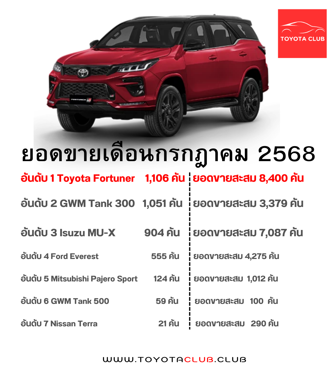 ยอดขายรถยนต์กลุ่ม SUV – PPV เดือนกรกฎาคม 2568 Toyota Fortuner ครอแชมป์ยอดขายขายเป็นอันดับ 1 และมียอดขายสะสมตั้งแต่เดือนมกราคม-กรกฎาคม 2568 รวม 8,400 คัน