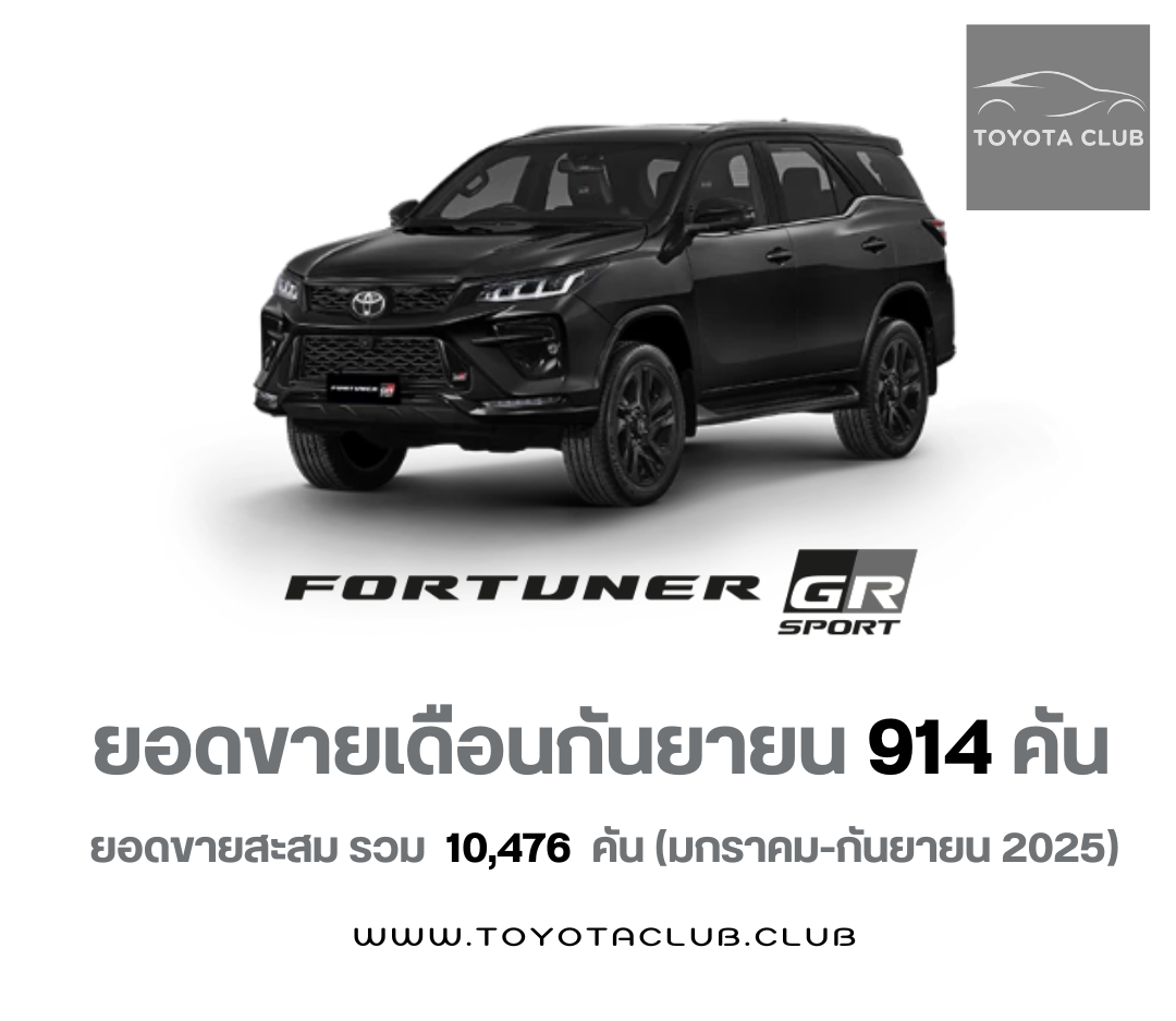 ยอดขายรถยนต์กลุ่ม SUV-PPV เดือนกันยายน อันดับ 1 Toyota Fortuner จำนวน 914 คัน ยอดขายสะสมตั้งแต่เดือน มกราคม-กันยายน 2025 รวม 10,476 คัน