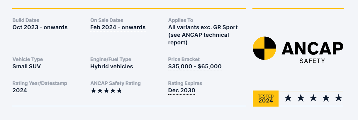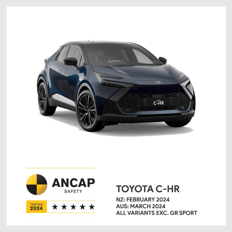 Toyota C-HR เปิดตัวในนิวซีแลนด์ในเดือนกุมภาพันธ์ พ.ศ. 2567 และเปิดตัวในออสเตรเลียในเดือนมีนาคม พ.ศ. 2567 ระดับความปลอดภัย ANCAP นี้ใช้กับรถยนต์ไฮบริดทุกรุ่น ยกเว้น GR Sport
